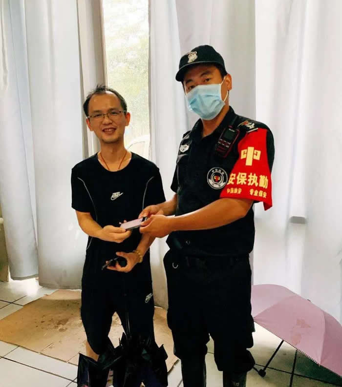 6月(yuè)7日(rì)上(shàng)午9時(ε shí)34分(fēn)許,我司駐金(jīn)融街(ji∞÷ē)安保大(dà)隊海(hǎi)公園分(fēn)隊隊員(yuán)黃(hu→φ✘áng)敬威值崗巡邏期間(jiān),經£★±過園區(qū)G棟附近(jìn)時(shíγλ÷)拾到(dào)手機(jī)一(yī)部,隊員(yuá$↔©n)黃(huáng)敬威立即查看(kàn)四周情況,當時(shí)大(dà)♠•€→雨(yǔ)滂沱,附近(jìn)無其他(tā)§✔人(rén)員(yuán)出現(xiàn),該隊員(yuán)冒☆ £著(zhe)大(dà)雨(yǔ)在原地(dì)等待數(shù)分δ(fēn)鐘(zhōng)後依然無失主前來($ ®lái)認領,因天氣原因,他(tā)立即上(shàng)報(♠Ωbào)情況并将失物(wù)交予負責人(ré÷∞✔n)吳書(shū)容處後,便立即繼續值崗巡邏工(gōng≈☆)作(zuò)。